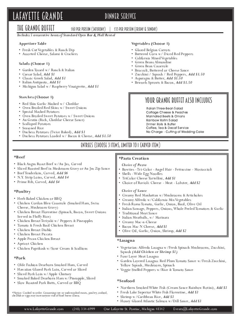 LAFAYETTE GRANDE The Grande Buffet dinner service $60 per person (Saturday) | $55 Per Person (Friday & Sunday)Includes 5 consecutive hours of Standard Open Bar & Hall Rental Appetizer TableVegetables