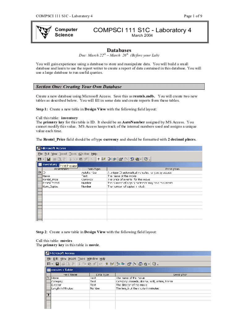 COMP SCI 111 S1C Laboratory 4Computer Science Page 1 of 9COMPSCI 111 S1C Laboratory 4 March 2004DatabasesDue: March 22nd March 26th (Before your Lab) You will gain experience using a database to store