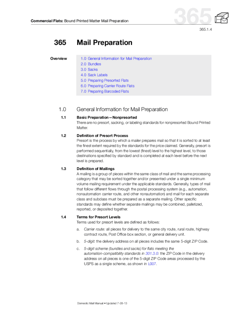 Commercial Flats: Bound Printed Matter Mail Preparation365365.1.4365Mail Preparation 1.0 2.0 3.0 4.0 5.0 6.0 7.0Overview1.0General Information for Mail Preparation Bundles Sacks Sack Labels Preparing