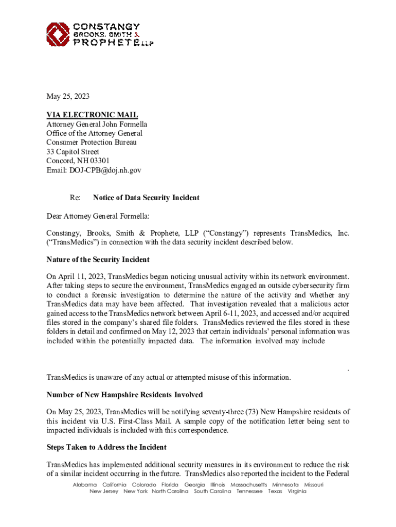 May 25, 2023, VIA ELECTRONIC MAIL Attorney General John Formerly Office of the Attorney General Consumer Protection Bureau 33 Capitol Street Concord, NH 03301 Email: DOJCPB@doj.nh.gov Re:Notice of