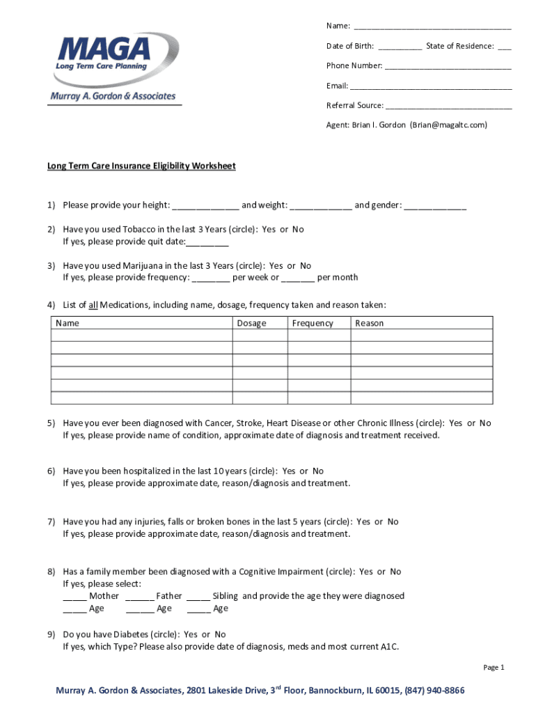 Name: ___ Date of Birth: ___ State of Residence: ___ Phone Number: ___ Email: ___ Referral Source: ___ Agent: Brian I. Gordon (Brian@magaltc.com)Long Term Care Insurance Eligibility Worksheet1) Please