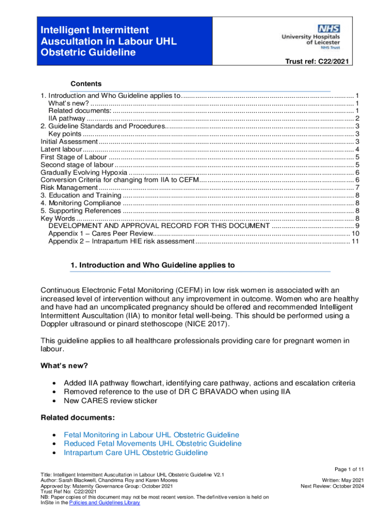 Intelligent Intermittent Auscultation in Labor UHF Obstetric Guideline Trust ref: C22/2021 Contents 1. Introduction and Who is a Guideline applies to ......................................................................................