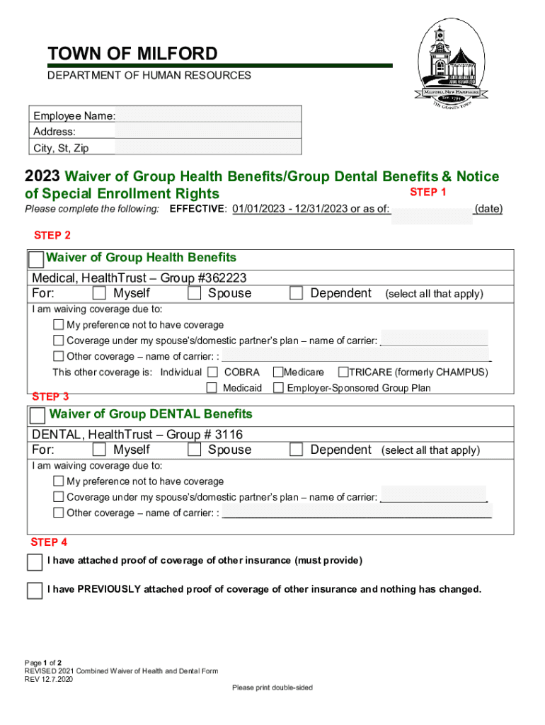 TOWN OF MILFORD DEPARTMENT OF HUMAN RESOURCES Employee Name: Address: City, St, Zip2023 Waiver of Group Health Benefits/Group Dental Benefits & Notice of Special Enrollment Rights Please complete