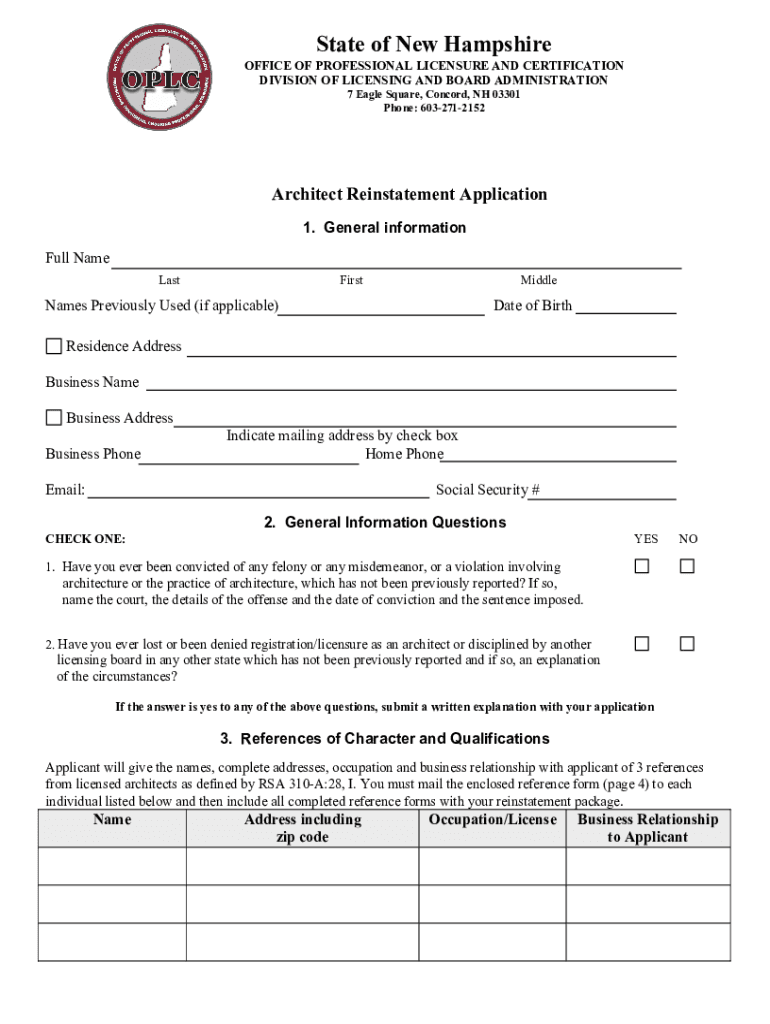 State of New HampshireOFFICE OF PROFESSIONAL LICENSURE AND CERTIFICATION DIVISION OF LICENSING AND BOARD ADMINISTRATION 7 Eagle Square, Concord, NH 03301 Phone: 6032712152Architect Reinstatement Application