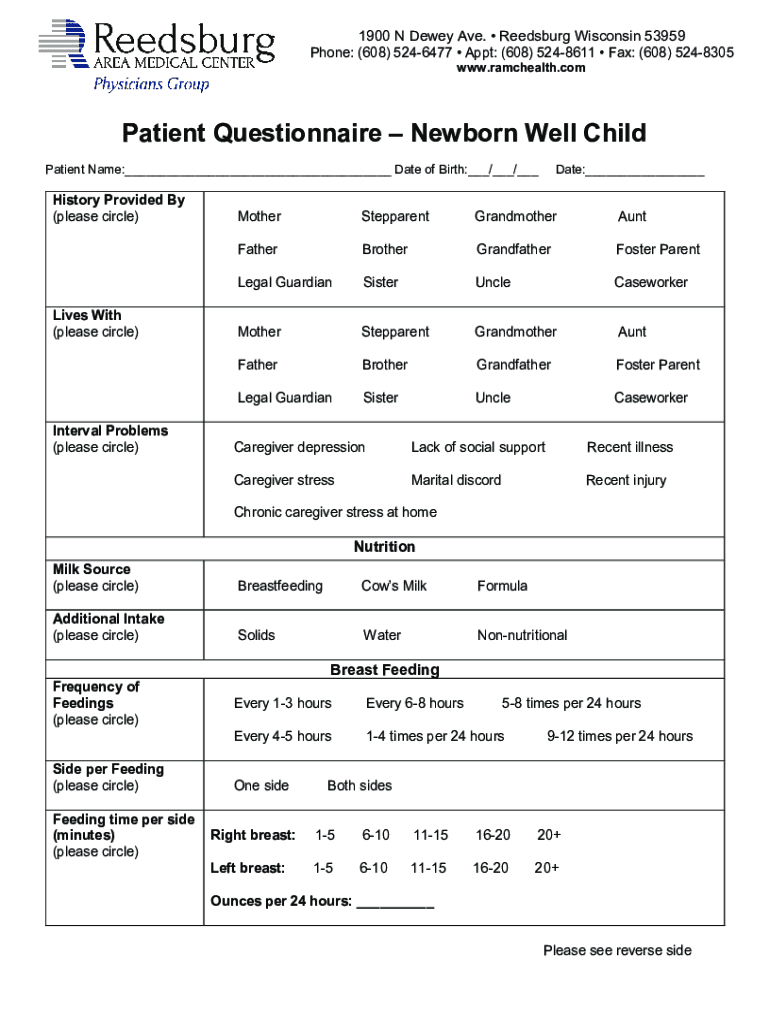 1900 N Dewey Ave. Reeds burg Wisconsin 53959 Phone: (608) 5246477 Apt: (608) 5248611 Fax: (608) 5248305 www.ramchealth.comPatient Questionnaire Newborn Well Child Patient Name:___ Date of Birth:___/___/___History