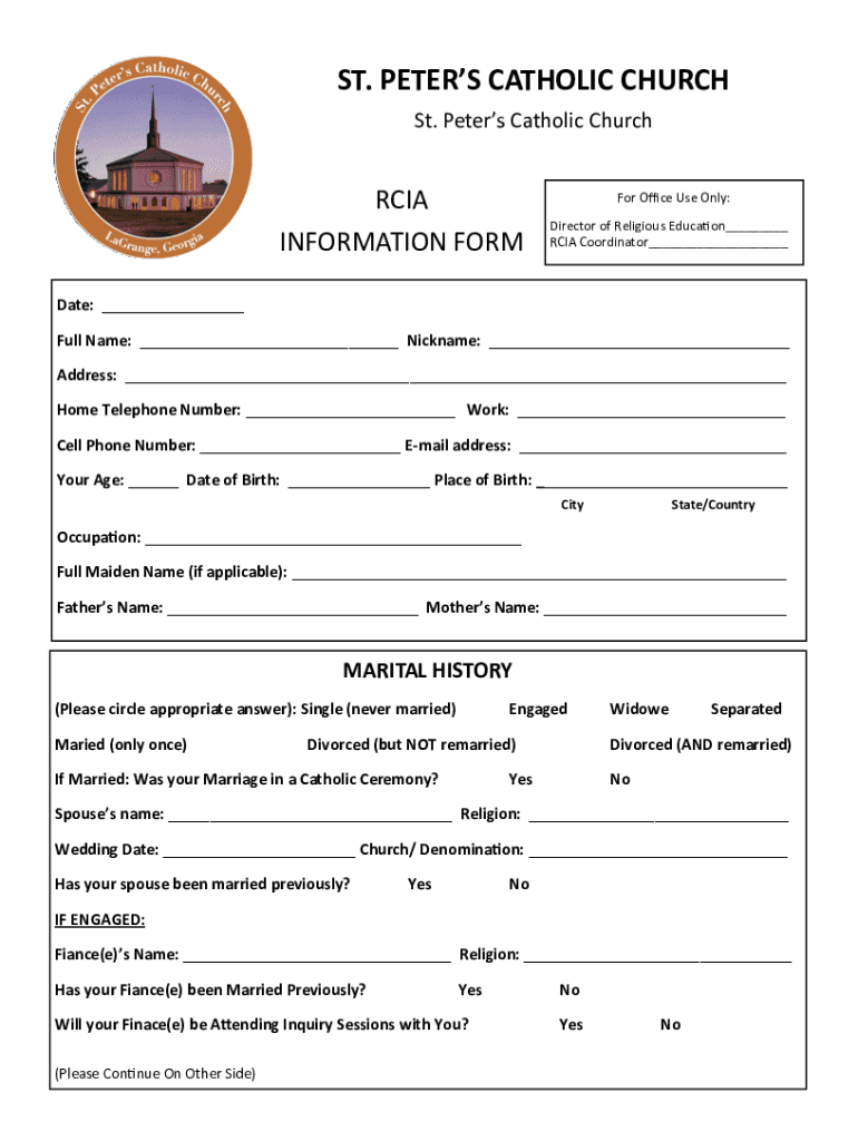 ST. PETERS CATHOLIC CHURCH St. Peters Catholic ChurchRCIA INFORMATION Former Office Use Only: Director of Religious Education___ CIA Coordinator___Date: ___ Full Name: ___ Nickname: ___ Address: ___