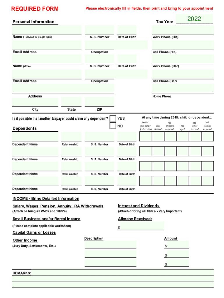 REQUIRED Formulas electronically fill in fields, then print and bring to your appointment2022Personal Informational Year ___Name (Husband or Single Filer's. S. NumberEmail Addressable of Earthwork