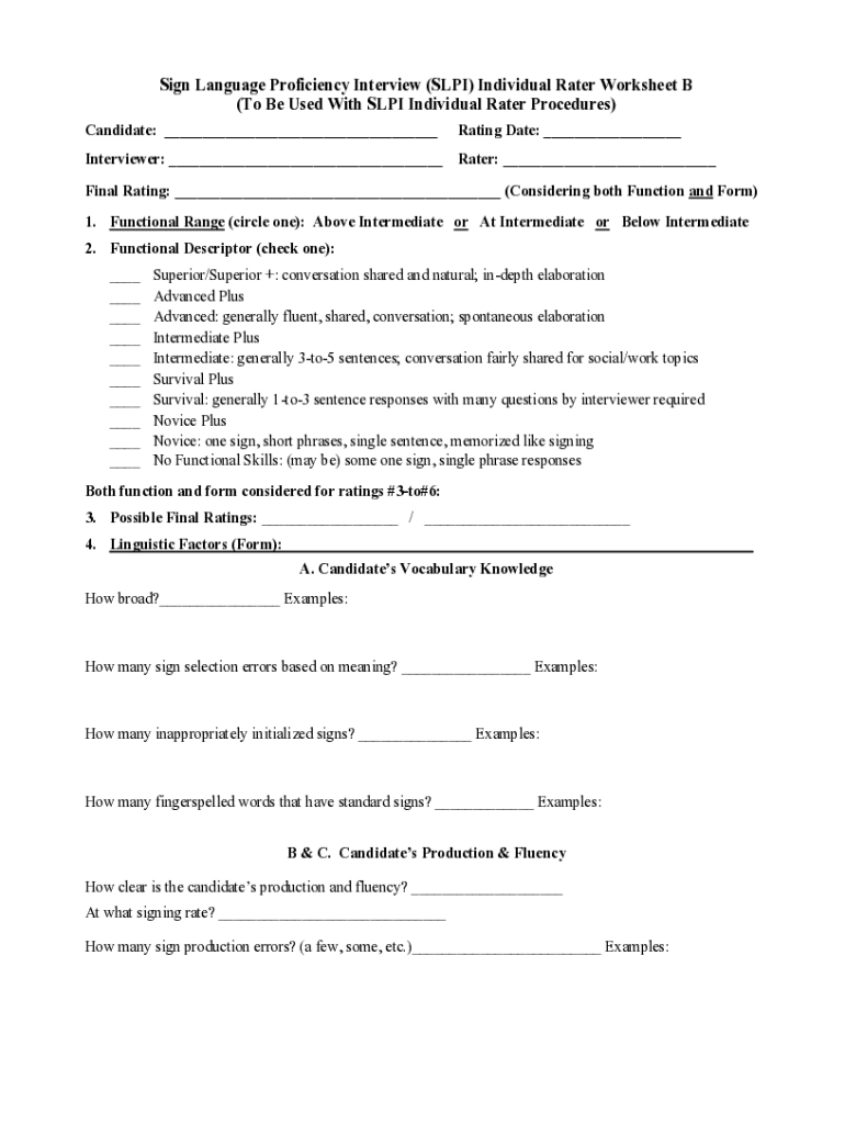 Sign Language Proficiency Interview (SLP) Individual Rater Worksheet B (To Be Used With SLP Individual Rater Procedures) Candidate: ___Rating Date: ___Interviewer: ___ Rater: ___ Final Rating: ___