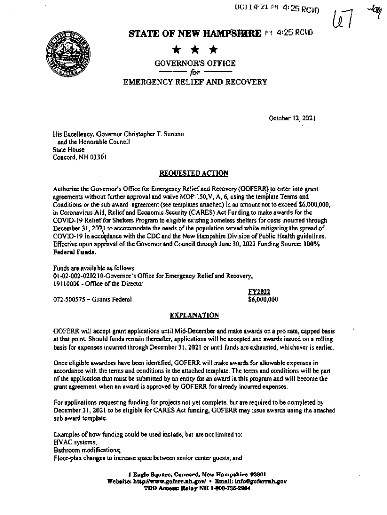 \'5:25RCUDI^Ul STATE OF NEW HAMPSHIRE p\” 4:25 Radio if IR GOVERNOR\'S OFFICE for EMERGENCY RELIEF AND RECOVERY October 12,2021His Excellency, Governor Christopher T. Sunny and the Honorable Council