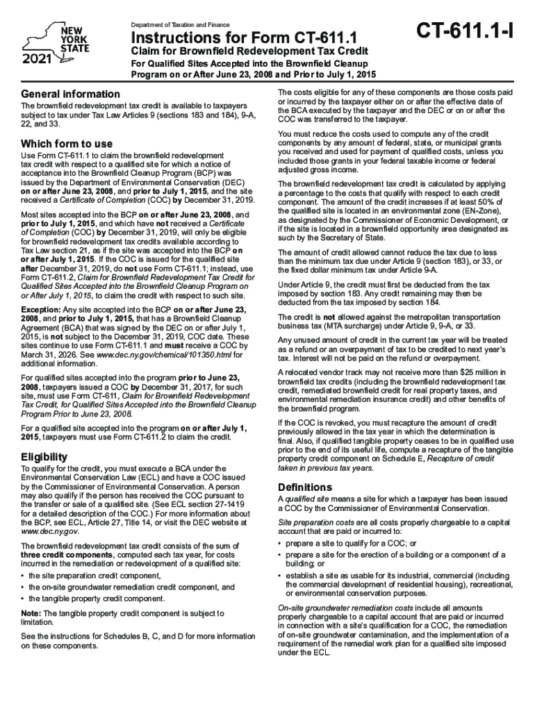 Department of Taxation and FinanceInstructions for FormCT611.1Claim for Brownfield Redevelopment Tax CreditCT611.1IFor Qualified Sites Accepted into the Brownfield Cleanup Program on or After June