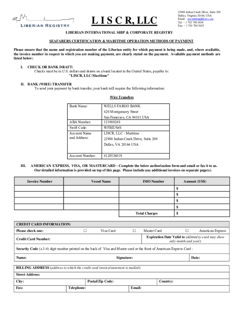 22980 Indian Creek Drive, Suite 200 Dulles, Virginia 20166, USA Email: accounting@liscr.com Tel: + 1 703 790 3434 Fax: + 1 703 790 5655L I S C R, LLC LIBERIAN INTERNATIONAL SHIP & CORPORATE REGISTRYSEAFARERS