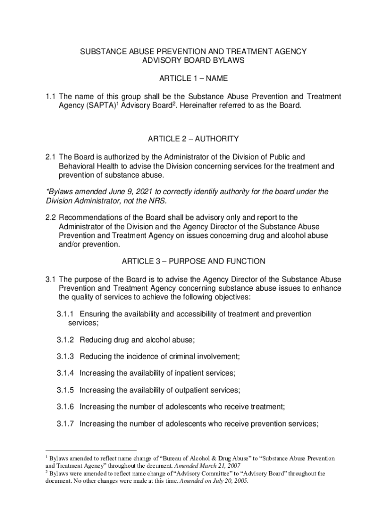 SUBSTANCE ABUSE PREVENTION AND TREATMENT AGENCY ADVISORY BOARD BYLAWS ARTICLE 1 NAME 1.1 The name of this group shall be the Substance Abuse Prevention and Treatment Agency (SANTA)1 Advisory Board2.