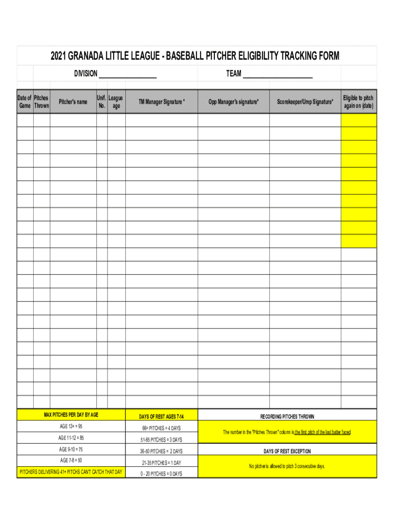 2021 GRANADA LITTLE LEAGUE BASEBALL PITCHER ELIGIBILITY TRACKING FORM