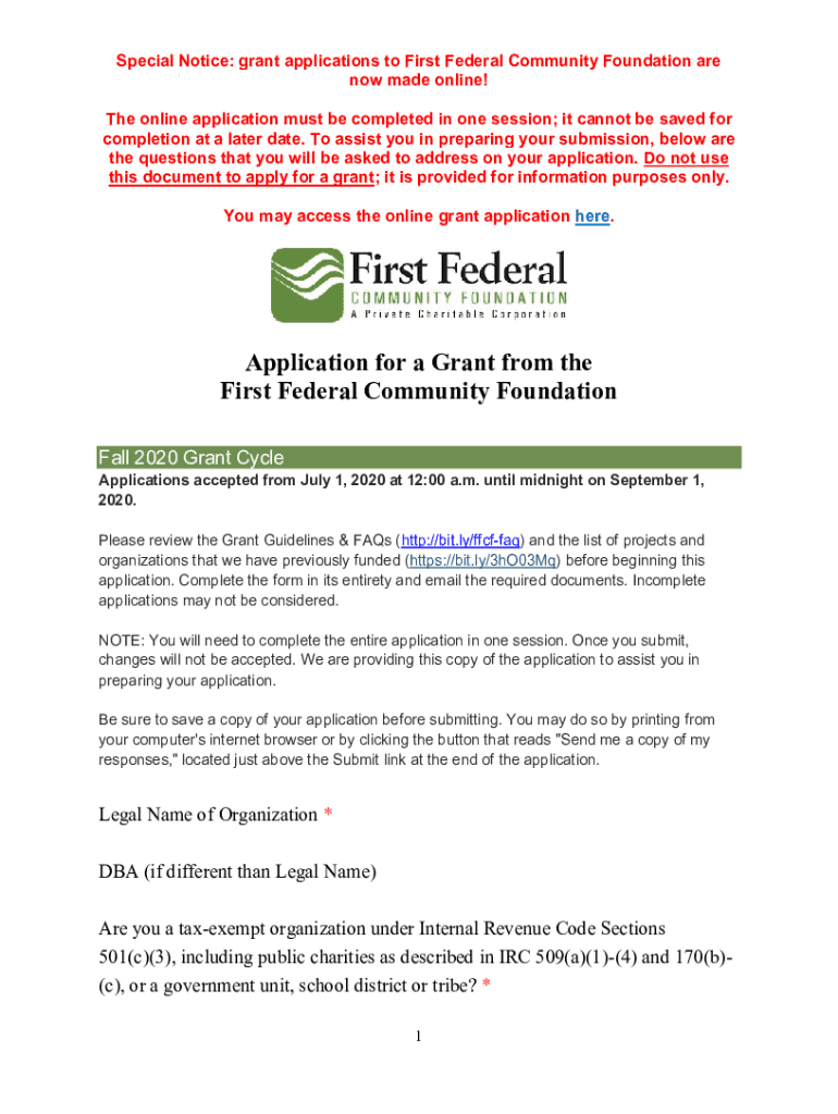 Special Notice: grant applications to First Federal Community Foundation are now made online! The online application must be completed in one session; it cannot be saved for completion at a later
