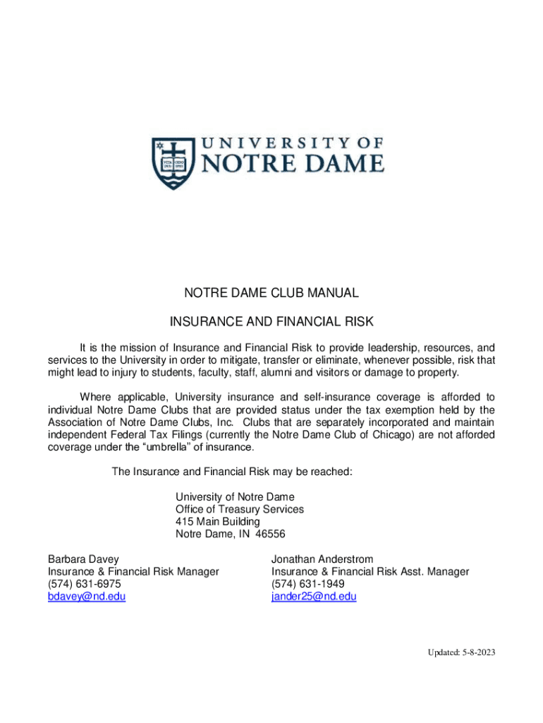 Get the free NOTRE DAME CLUB MANUAL INSURANCE AND ... - treasury nd
