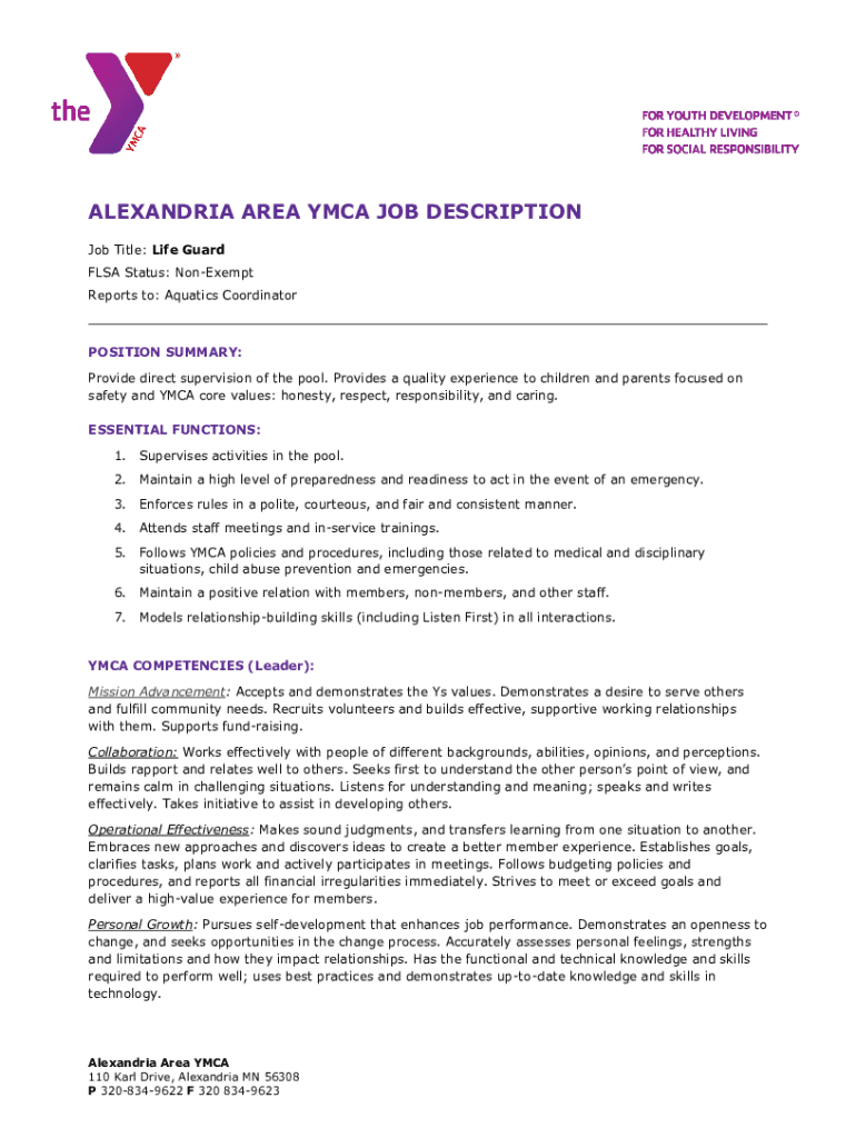 ALEXANDRIA AREA YMCA JOB DESCRIPTION Job Title: Lifeguard FLEA Status: Nonexempt Reports to: Aquatics CoordinatorPOSITION SUMMARY: Provide direct supervision of the pool. Provides a quality experience