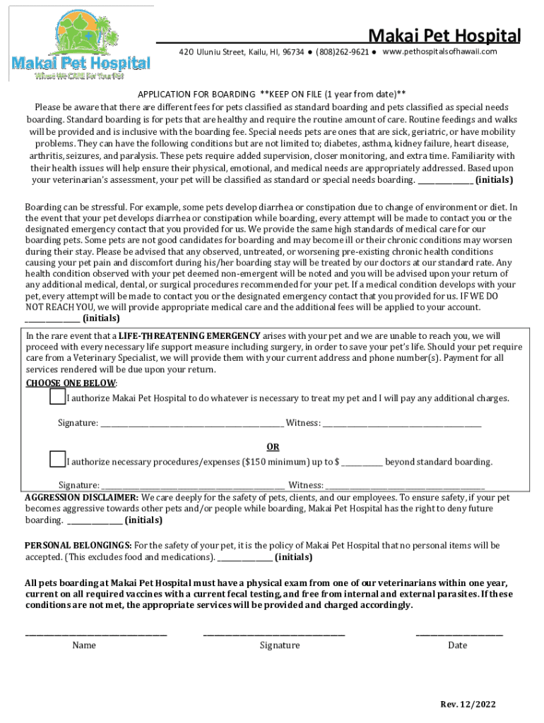 Sakai Pet Hospital 420 Ubuntu Street, Kiel, HI, 96734 (808)2629621 www.pethospitalsofhawaii.comAPPLICATION FOR BOARDING **KEEP ON FILE (1 year from date)** Please be aware that there are different