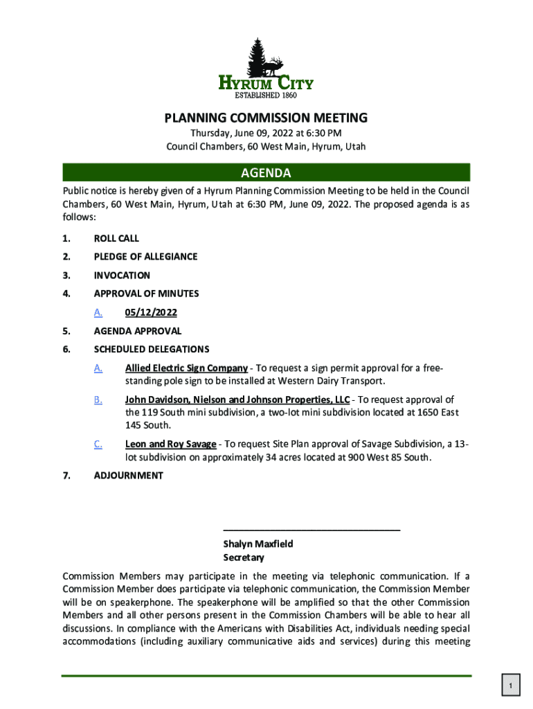 PLANNING COMMISSION MEETING Thursday, June 09, 2022, at 6:30 PM Council Chambers, 60 West Main, Drum, UtahAGENDA Public notice is hereby given of a Drum Planning Commission Meeting to be held in the