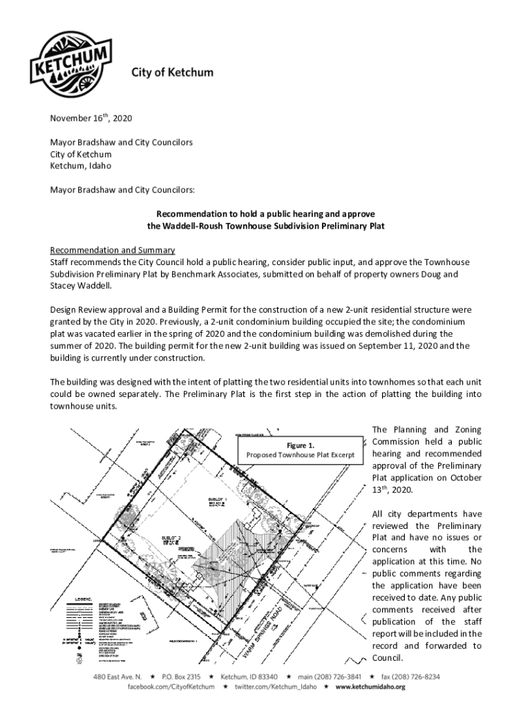 November 16th, 2020 Mayor Bradshaw and City Councilors City of Ketchup, Idaho Mayor Bradshaw and City Councilors: Recommendation to hold a public hearing and approve the WaddellRoush Townhouse Subdivision