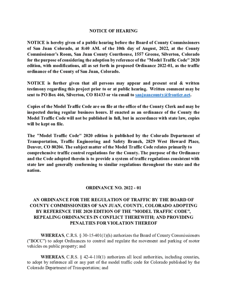 NOTICE OF HEARING NOTICE is hereby given of a public hearing before the Board of County Commissioners of San Juan Colorado, at 8:40 AM. of the 10th day of August 2022, at the County Commissioners