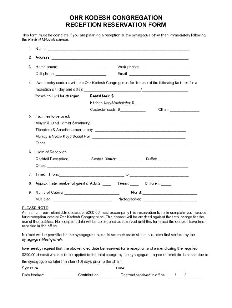 OR KOD ESH CONGREGATION RECEPTION RESERVATION From This form must be complete if you are planning a reception at the synagogue other than immediately following the Bar/Bat Mitzvah service. 1. Name: