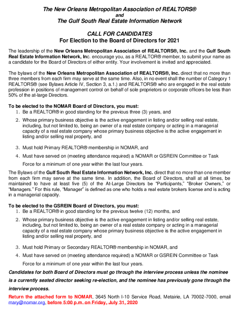 The New Orleans Metropolitan Association of REALTORS another Gulf South Real Estate Information Network CALL FOR CANDIDATES For Election to the Board of Directors for 2021 The leadership of the New