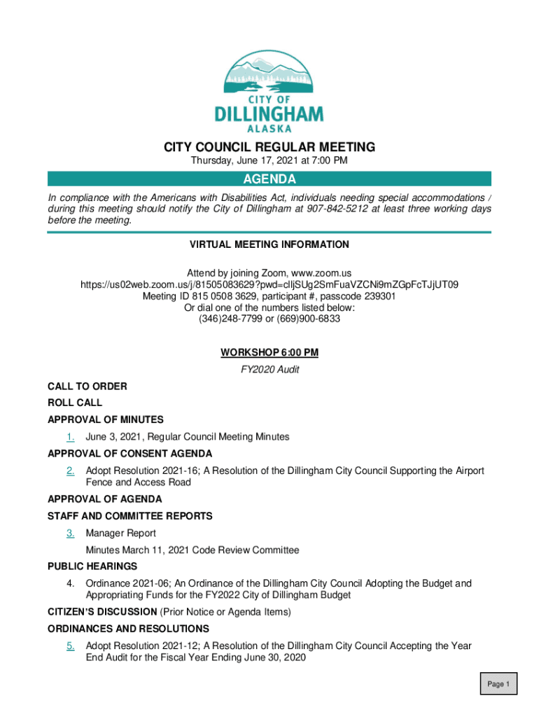CITY COUNCIL REGULAR MEETING Thursday, June 17, 2021, at 7:00 AGENDA In compliance with the Americans with Disabilities Act, individuals needing special accommodations / during this meeting should