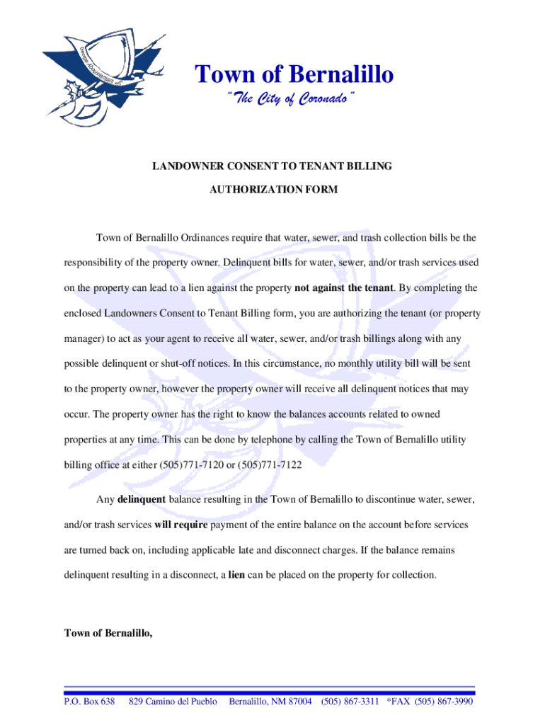 Town of Bernalillo The City of CoronadoLANDOWNER CONSENT TO TENANT BILLING AUTHORIZATION Yorktown of Bernalillo Ordinances require that water, sewer, and trash collection bills be the responsibility
