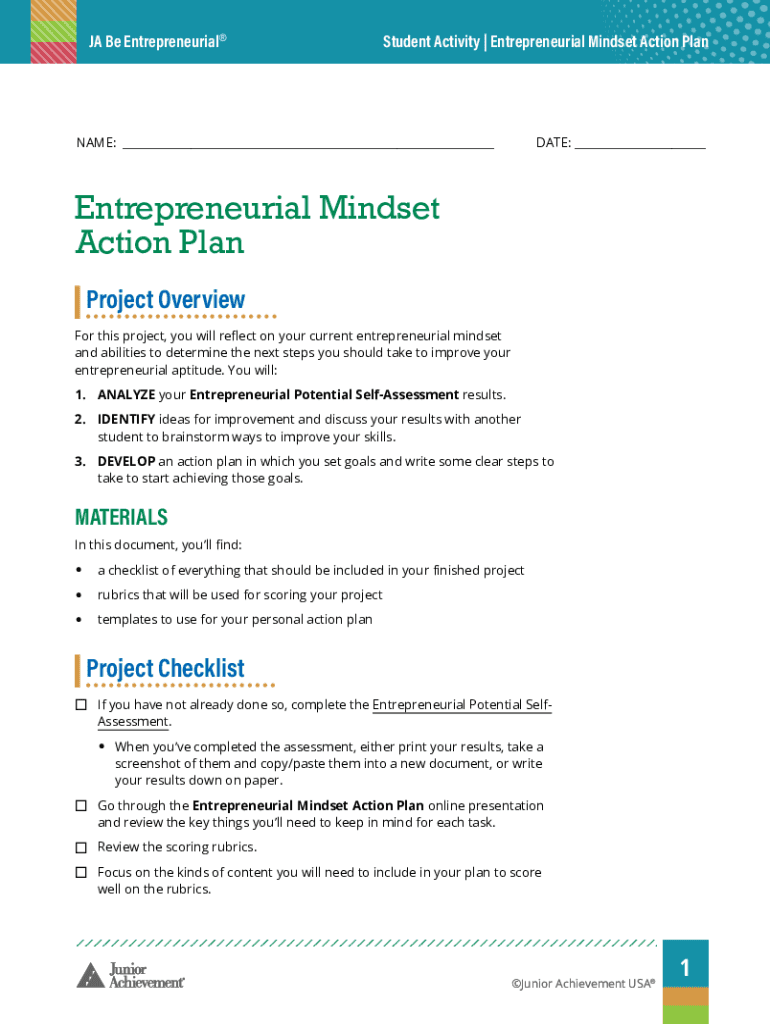 JA Be EntrepreneurialStudent Activity | Entrepreneurial Mindset Action Planned: ___DATE: ___Entrepreneurial Mindset