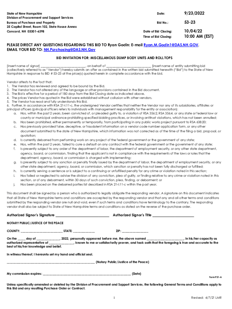 Get the free BID INVITATION FOR: MISCELLANOUS DUMP BODY UNITS AND ROLL TOPS