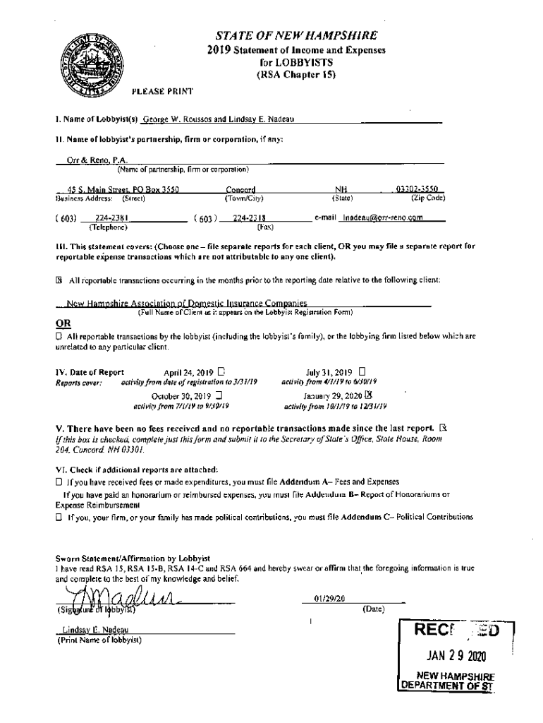 STA TE OF NEW HAMPSHIRE2019 Statement of Income and Expenses for LOBBYISTS(RSA Chapter 15) PLEASE PRINT. Name of Lobbyist(s) George W. Russo and Lindsay E. Nadcau11. Name lobbyist(*s partnership,