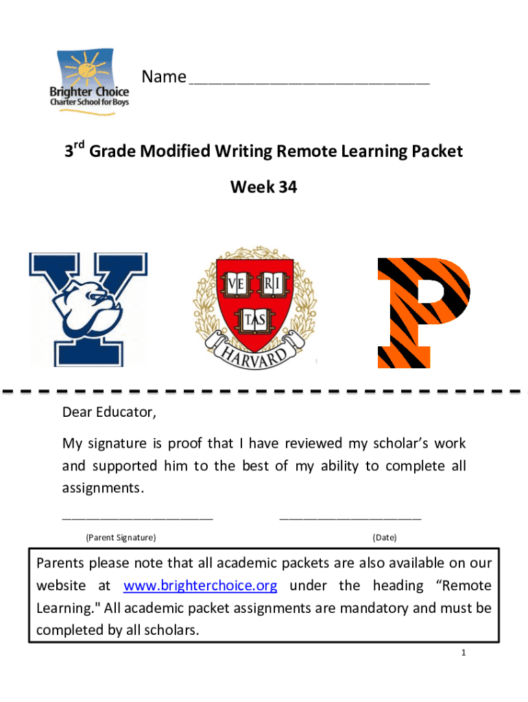 Name ___3rd Grade Modified Writing Remote Learning Packet Week 34Dear Educator, My signature is proof that I have reviewed my scholars work and supported him to the best of my ability to complete