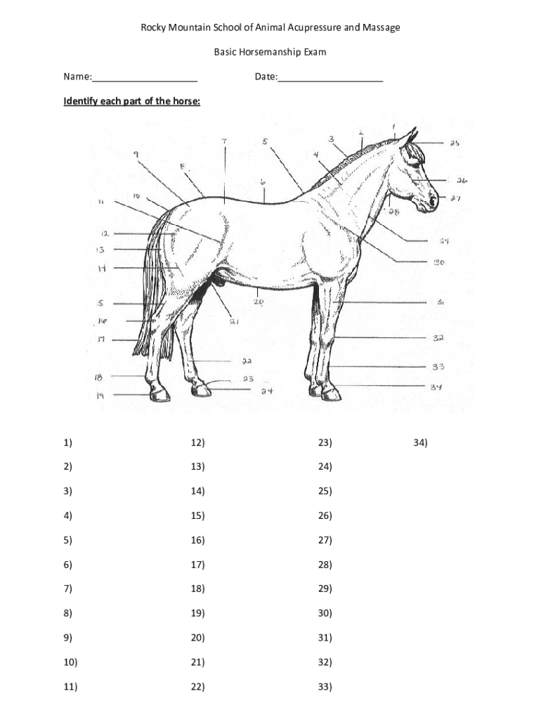 Rocky Mountain School of Animal Acupressure and Massage Basic Horsemanship Exam Name:___Date:___Identify each part of the horse:1)12)23)2)13)24)3)14)25)4)15)26)5)16)27)6)17)28)7)18)29)8)19)30)9)20)31)10)21)32)11)22)33)34)Fill