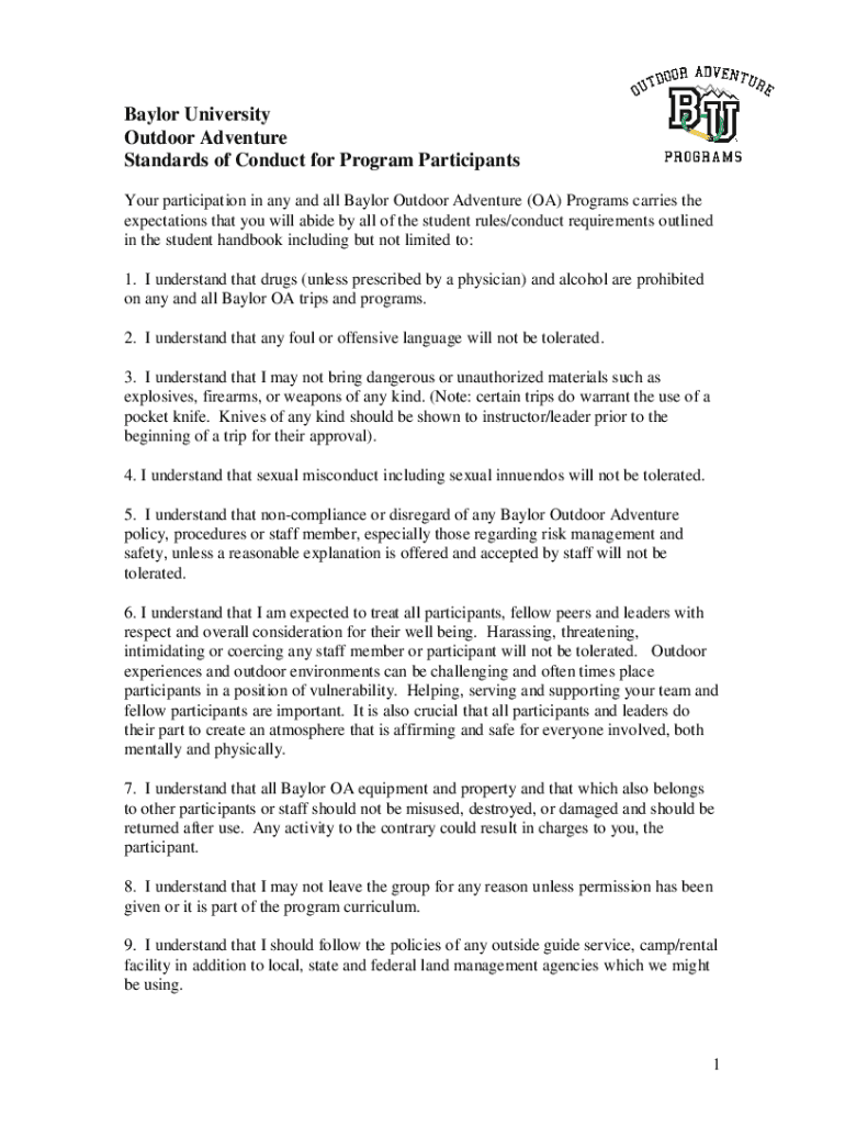 Baylor University Outdoor Adventure Standards of Conduct for Program Participants Your participation in any and all Baylor Outdoor Adventure (OA) Programs carries the expectations that you will abide