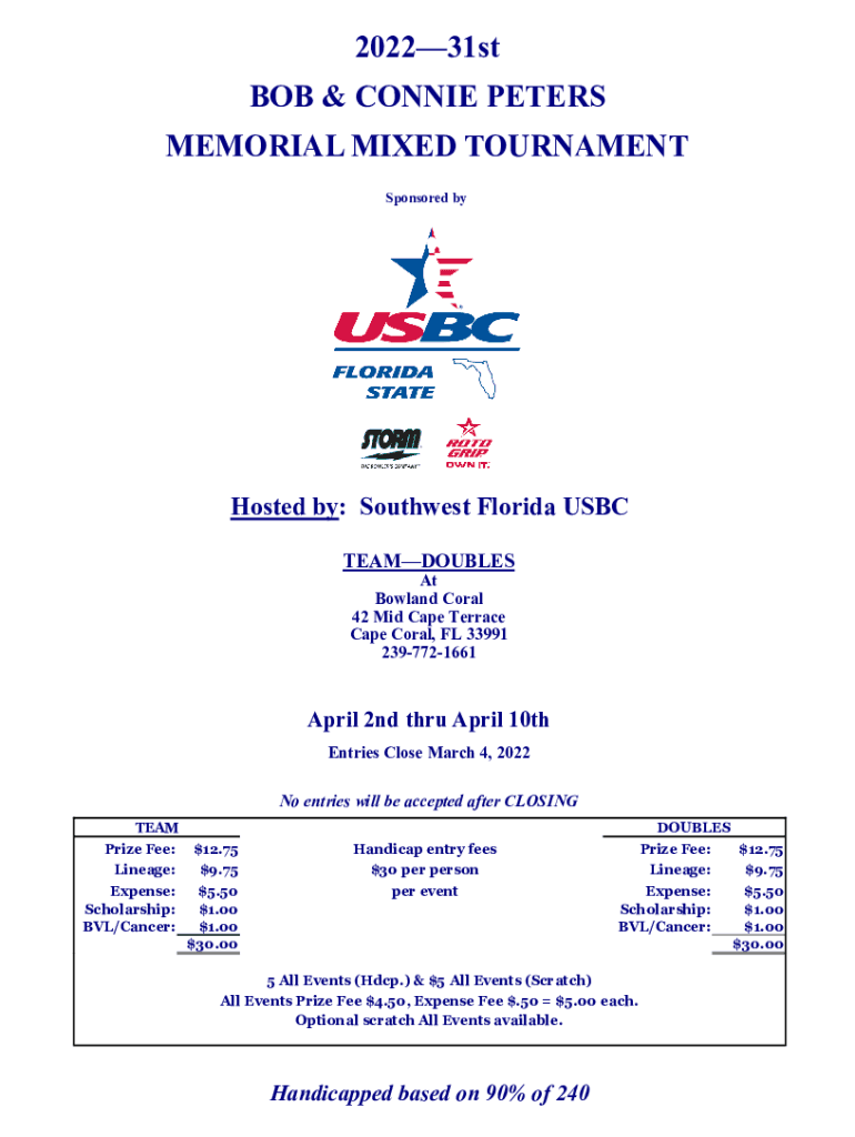 202231stBOB & CONNIE PETERS MEMORIAL MIXED TOURNAMENT Sponsored hosted by: Southwest Florida USB REDOUBLES At Bowland Coral 42 Mid-Cape Terrace Cape Coral, FL 33991 2397721661April 2nd through April