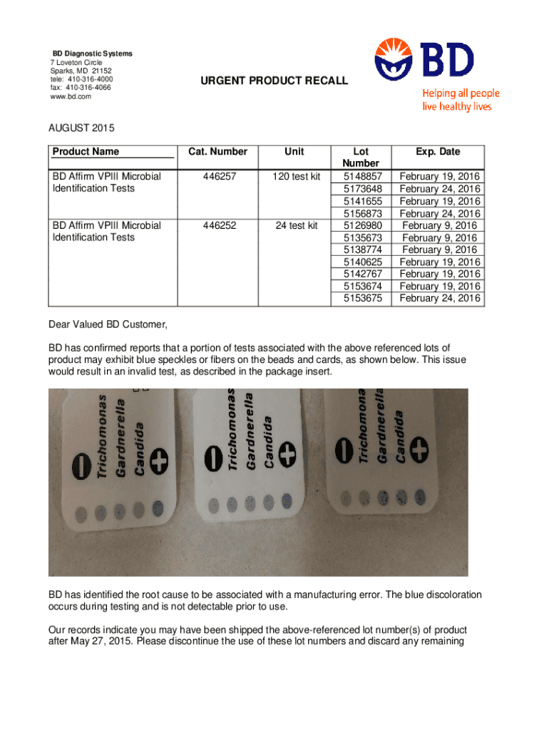 BD Diagnostic Systems 7 Love ton Circle Sparks, MD 21152 tell: 4103164000 fax: 4103164066 www.bd.comURGENT PRODUCT RECALLAUGUST 2015 Cat. NumberUnitBD Affirm VIII Microbial Identification Tests446257120