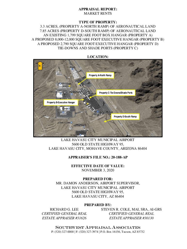 APPRAISAL REPORT: MARKET RENTS TYPE OF PROPERTY: 3.3 ACRES, (PROPERTY NORTH RAMP) OF AERONAUTICAL LAND 7.85 ACRES (PROPERTY SOUTH RAMP) OF AERONAUTICAL LAND AN EXISTING 1,799 SQUARE FOOT BOX HANGAR