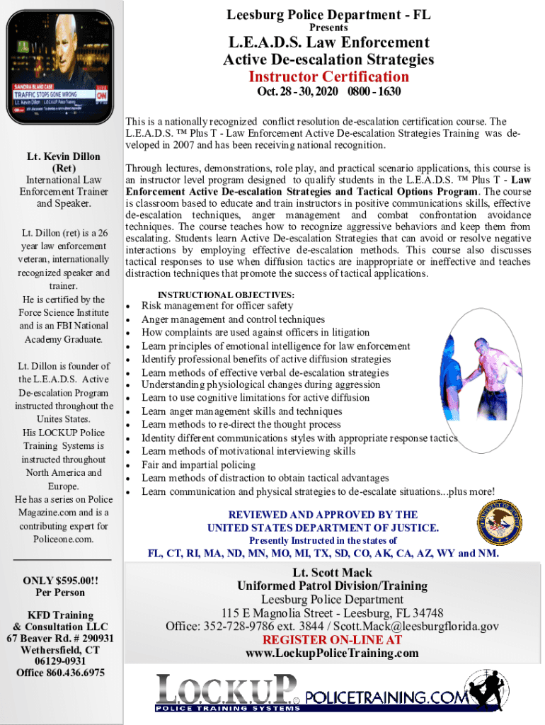Leesburg Police Department FL Presents. E.A.D.S. Law Enforcement Active Deescalation Strategies Instructor Certification Oct. 28 30, 2020 0800 1630Lt. Kevin Dillon (RET) International Law Enforcement