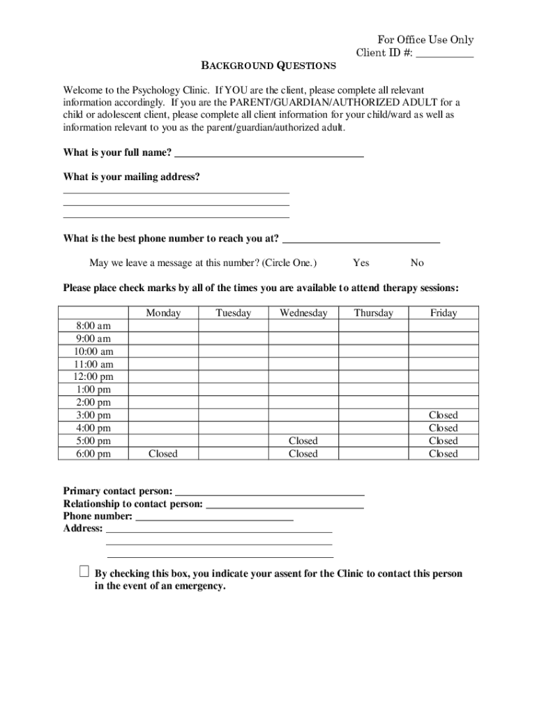 BACKGROUND Questions Office Use Only Client ID #: ___Welcome to the Psychology Clinic. If YOU are the client, please complete all relevant information accordingly. If you are the PARENT/GUARDIAN/AUTHORIZED