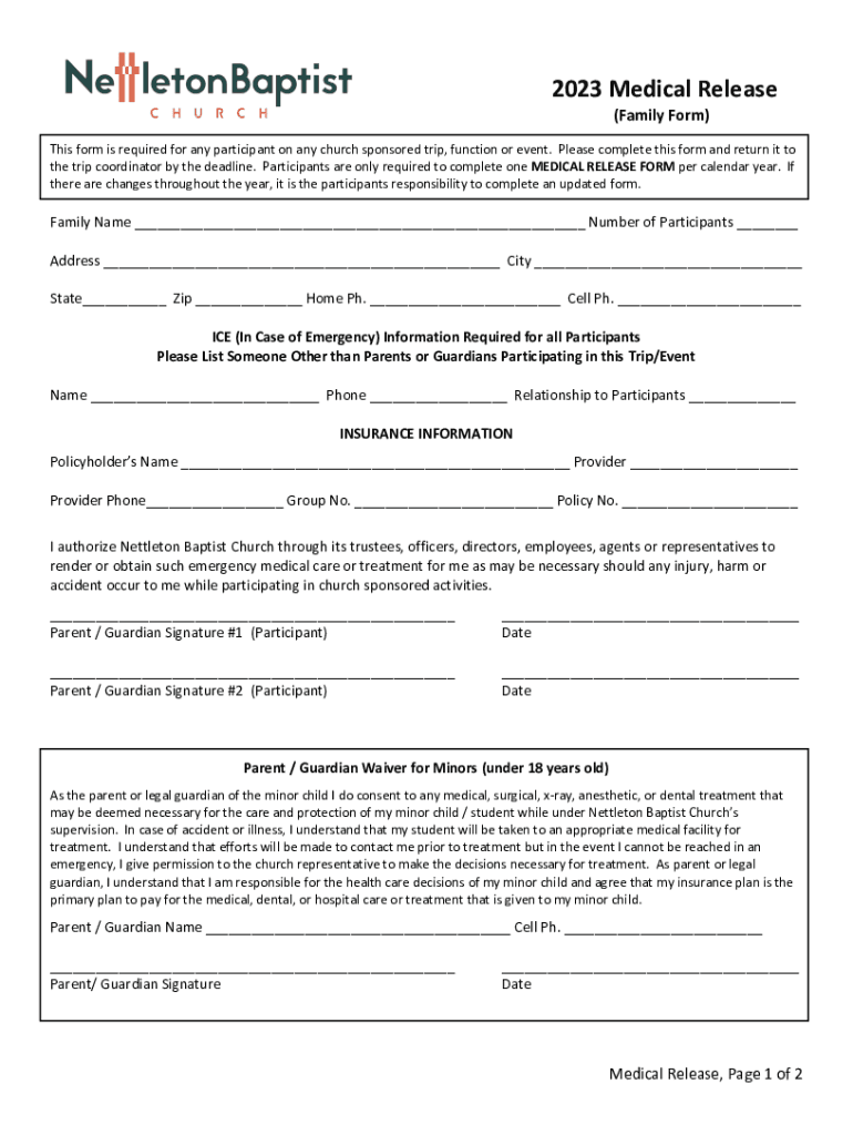 2023 Medical Release (Family Form) This form is required for any participant on any church sponsored trip, function or event. Please complete this form and return it to the trip coordinator by the