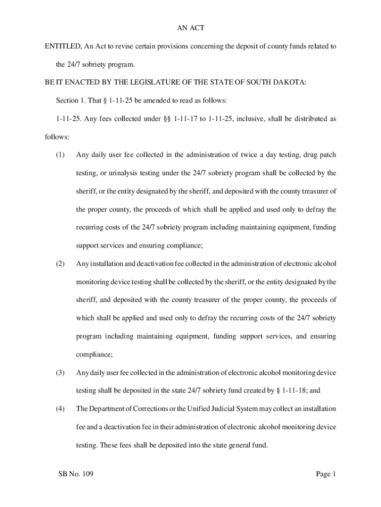AN ACT ENTITLED, An Act to revise certain provisions concerning the deposit of county funds related to the 24/7 sobriety program. BE IT ENACTED BY THE LEGISLATURE OF THE STATE OF SOUTH DAKOTA: Section
