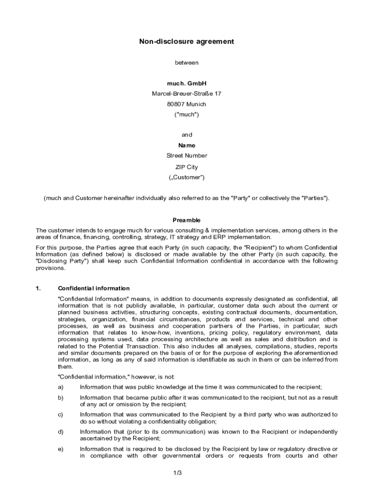 Nondisclosure agreement between much. GmbH MarcelBreuerStrae 17 80807 Munich (\” much\”) and Name Street Number ZIP City (Customer) (much and Customer hereinafter individually also referred to