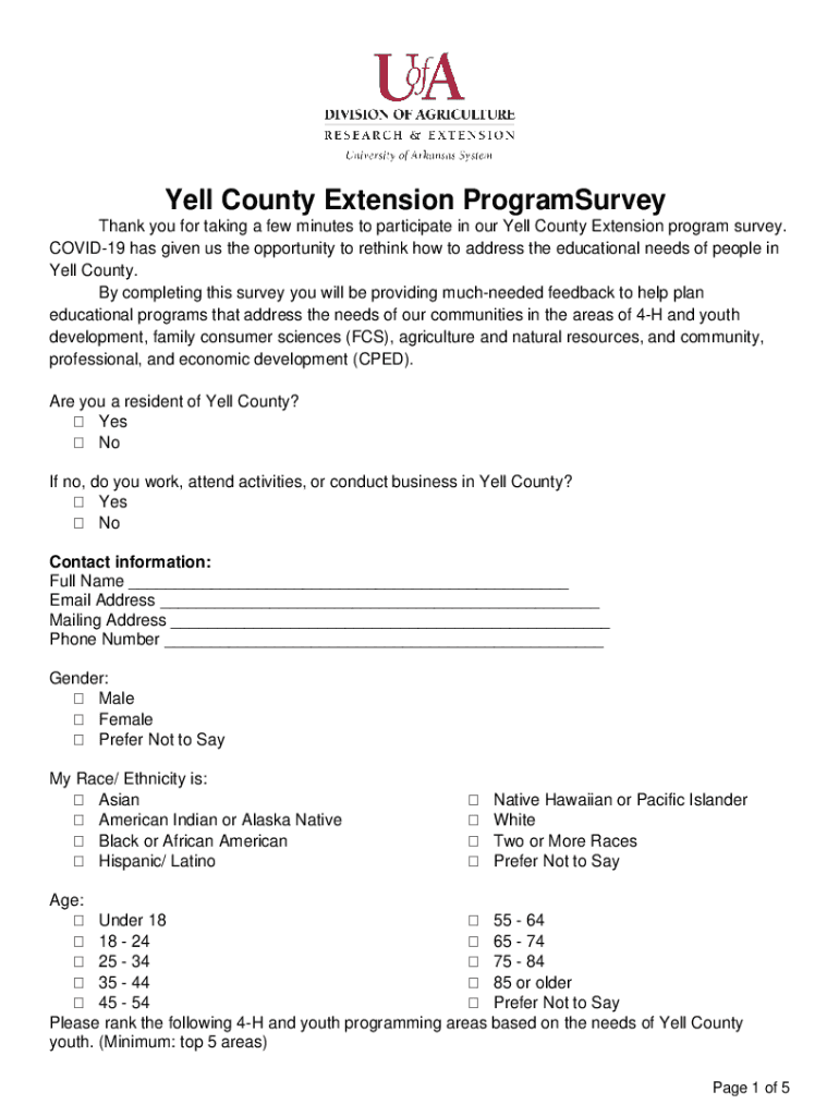 Yell County Extension Program Survey Thank you for taking a few minutes to participate in our Yell County Extension program survey. COVID-19 has given us the opportunity to rethink how to address