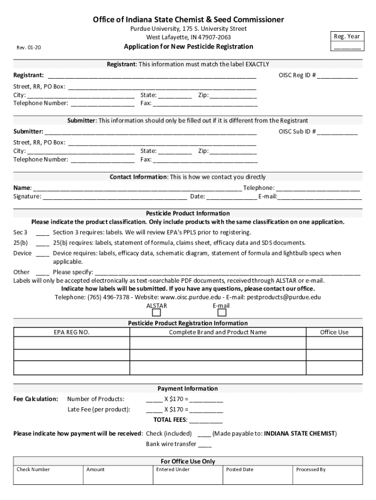 Office of Indiana State Chemist & Seed Commissioner Purdue University, 175 S. University Street West Lafayette, IN 479072063Reg. Year ___Application for New Pesticide Registration Rev. 0120Registrant: