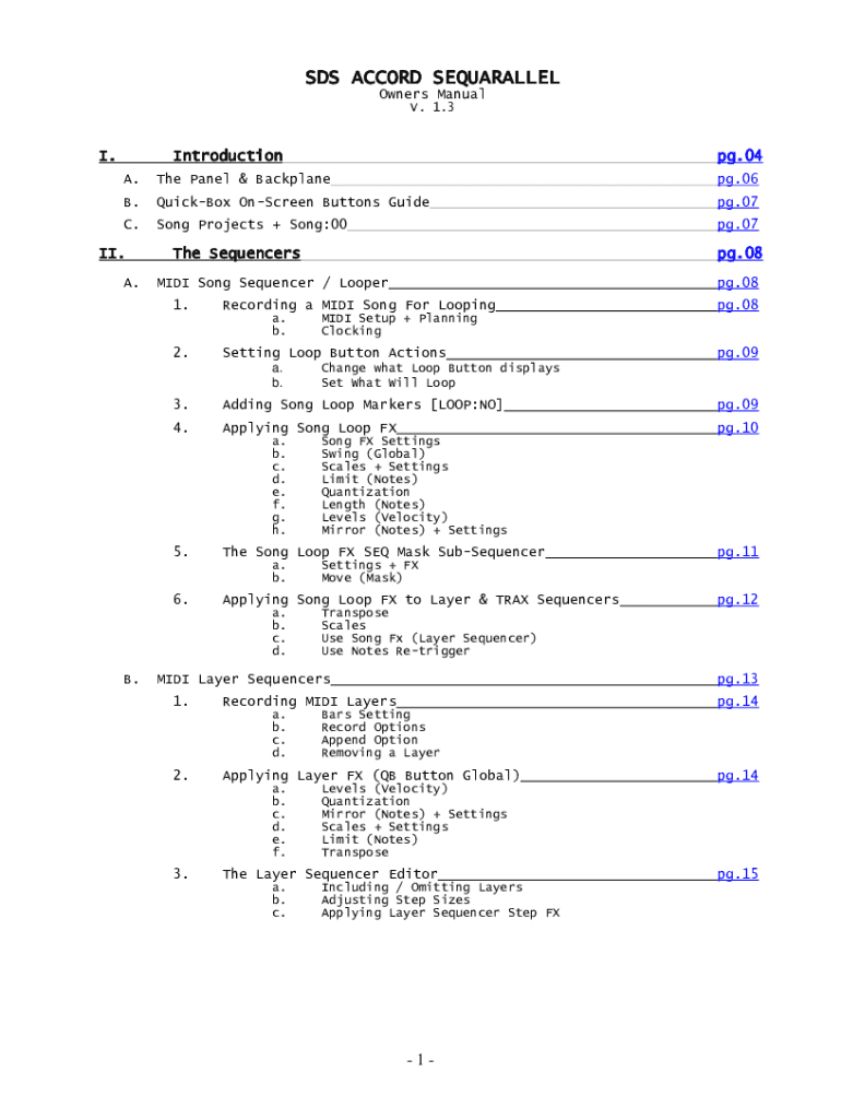 SDS ACCORD SEQUARALLEL Owners Manual V. 1.3I. Introduction pg.04A. The Panel & Backplate.06B. Kickbox OnScreen Buttons Guide pg.07C. Song Projects + Song:00 pg.07II. A. The Sequencers MIDI Song Sequencer