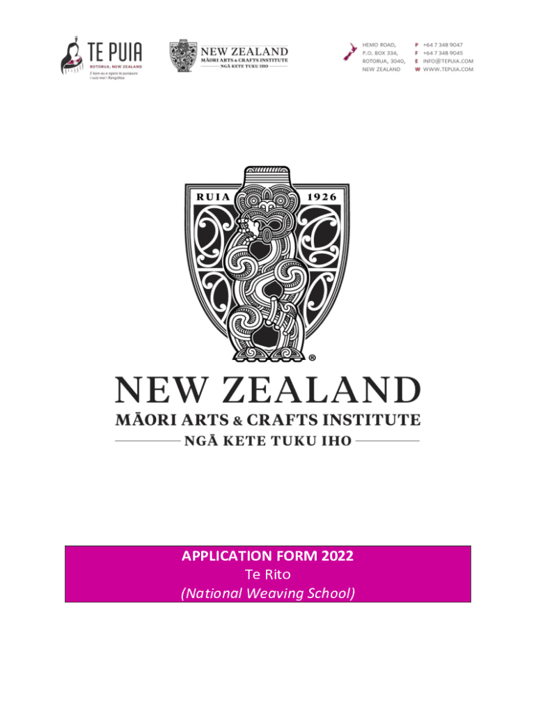 APPLICATION FORM 2022 Te Rico (National Weaving School)INTRODUCTION We are now seeking applications for Te Rico (National Weaving School). Applicants must be of More descent, aged 18 years or over