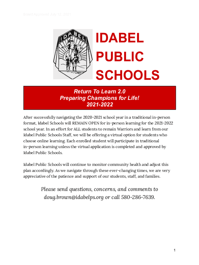Board Approved July 12, 2021IDABEL PUBLIC SCHOOLS Return To Learn 2.0 Preparing Champions for Life! 20212022 After successfully navigating the 20202021 school year in a traditional unperson format,