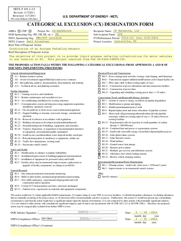 (Previous Editions Obsolete)U.S. DEPARTMENT OF ENERGY NETLCATEGORICAL EXCLUSION (CX) DESIGNATION FORM