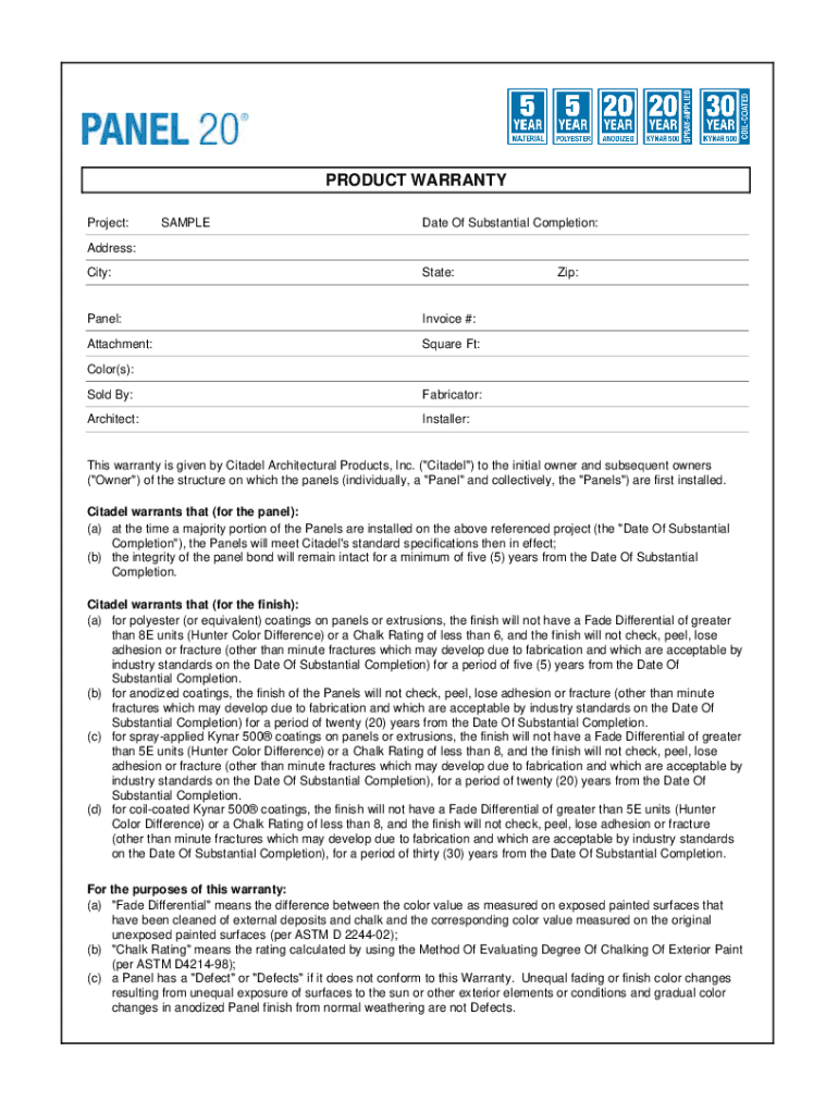 PRODUCT WARRANTY Project:SAMPLED ate Of Substantial Completion:Address: City:State:Panel:Invoice #:Attachment:Square Ft:Zip:Color(s): Sold By:Fabricator:Architect:Installer:This warranty is given