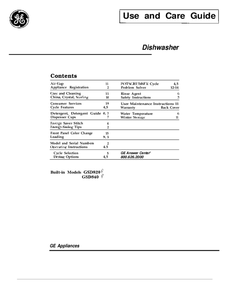 Use and Care GuideDishwasherContents Air Gap Appliance Registration11 2POTSCRUBBER Cycle Problem Silverware and Cleaning China, Crystal, Sterfing11 10Rinse Agent Safety InstructionsConsumer Services